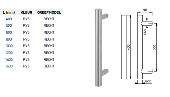 RVS GREEP MET SCHUINE POOTJES - 400 MM | 1000 MM | 1600 MM